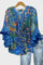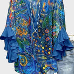 Karen | Kunstnerisk Blå løfter dit outfit gennem en tydelig kunstnerisk ånd og dansk håndværk. Den klare blå baggrund fremhæver levende abstrakte mønstre, der minder om malerier på et lærred og vidner om omtanke i hvert snit. Med volangærmer og en afslappet pasform forenes elegance og bevægelsesfrihed, så både hverdagslook og finere anledninger får en sofistikeret kant. Dette plagg er mere end mode; det bærer en tidløs æstetik og en arv til detaljer og kvalitet, som giver garderoben langvarig værdi og særegen samlerværdi.