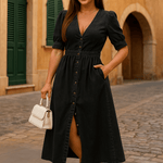 - Detaljer og æstetik: Frontknaplukning, puffede ærmer og rene linjer, der afspejler sofistikeret elegance og moderne lethed.