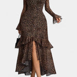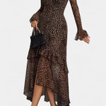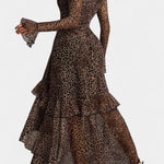 Mette | Maxi kjole udstråler diskret luksus og tidløs elegance. Den er omhyggeligt skabt med premium materialer og en håndværksmæssig tilgang, designet til at holde form og bevægelse gennem aftenen. Leopardskildringen i varme brune og beige nuancer tilfører karakter uden at være påtrængende, mens den firkantede halsudskæring omfavner dekolletage og hals på en flatterende måde. A-linjet silhuet giver plads til flydende bevægelser og tidløs stil, mens fine flounce-detaljer tilføjer dynamik og raffinement i kjolens bevægelser. Med et begrænset antal i kollektionen står kjolen som en investering i holdbar stil og en særlig arv, der tiltaler samlere og dem, der værdsætter historie og eksklusivitet.