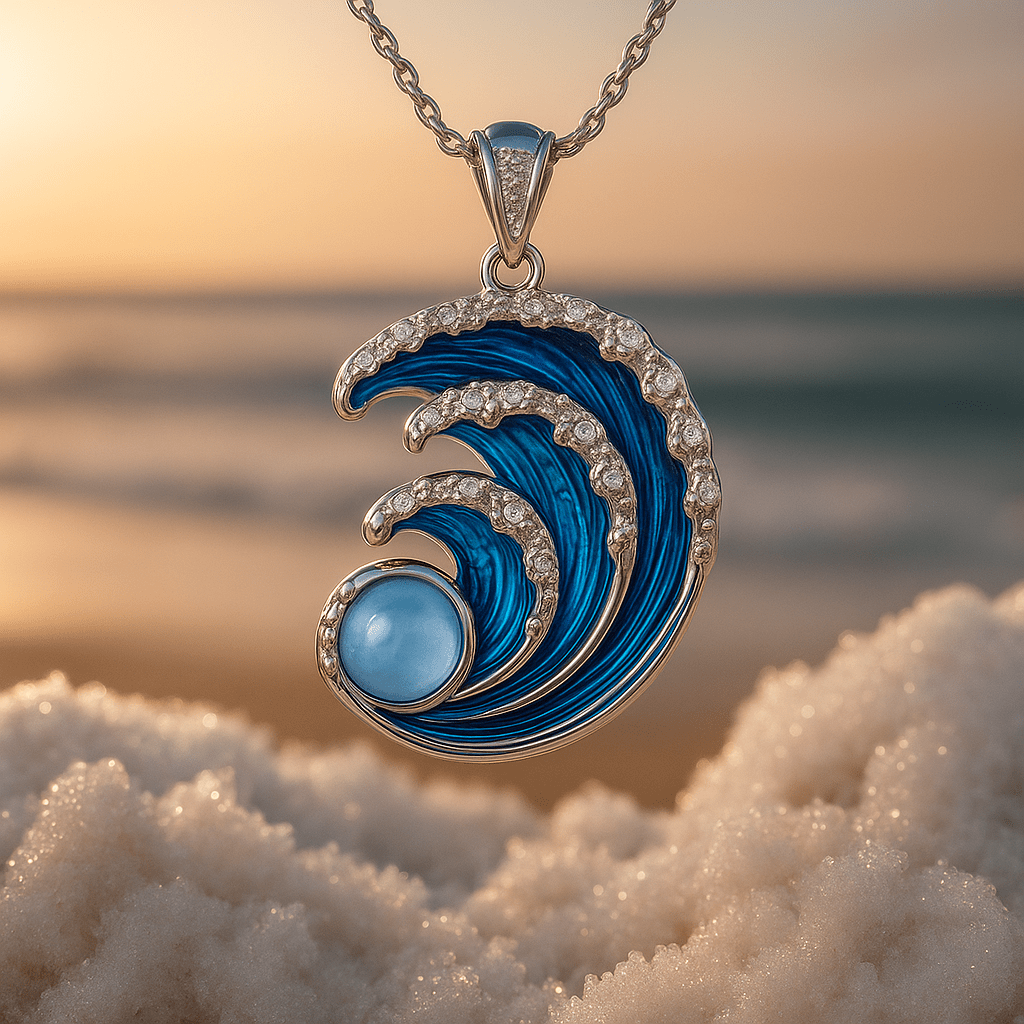 Ronja | Sølvbølge Vedhæng fanger havets poesi gennem verdensklasse håndværk. Inspireret af Neréas arv og havets hjerteslag, formidler den rytmen i ro og strøm, når det bæres tæt. Den blå gennemskinnelige harts smelter elegant sammen med sølvfarvet metal og giver et tidløst udtryk, hvor kantede detaljer glitrer som stjerneskær ned mod vandets overflade. Hvert element vidner om omtanke, kvalitet og en æstetik, der betragter smykker som kultur og håndværk i ét samlet resultat. Med begrænset antal og en tydelig forpligtelse til håndværkets kvalitet tilbyder Ronja tidløs elegance og en samlergenstand, der vokser i værdi og betydning over tid.