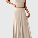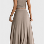 Anastasia | Sæt udstråler diskret luksus gennem håndværk og omtanke i hver detalje. Den rynkede, korte top fremhæver taljen med en sculptural finish, der tillader bevægelse, mens den konturerede talje giver en slank silhouette og den lange rok bevæger sig let med kroppen, hvilket skaber en tidløs, selvsikker fremtoning. Sættet balancerer styrke og lethed og tiltaler den krævende æstetiker, der værdsætter gennemført design og materialer af højeste kvalitet. Med blødt, åndbart materiale og luksuriøs drapering bliver Anastasia | Sæt en alsidig investering til brunch, aftener eller afslappede fester. Den tydelige herkomst mærkes gennem håndværk og premium detaljer, der understreger luksusfølelsen og holdbarheden. Begrænset antal i kollektionen understreger eksklusiviteten og den varige værdi for samlere og dem, der søger en tidløs garderobe med holdbar kvalitet.