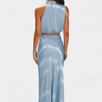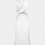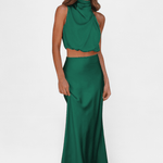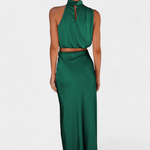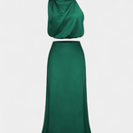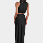 - Tidløs elegance – draperet halterneck-top med åben ryg og skulpturel silhuet, der udstråler moderne sensualitet uden at gå på kompromis med klassisk stil.