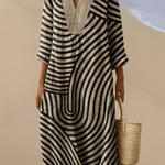 Ava Vis Kjole er et visuelt dynamisk stykke, der har dristige, kontrasterende striber i en chic monokrom palette. Det asymmetrisk design af striberne skaber en følelse af bevægelse, hvilket gør denne kjole til et iøjnefaldende valg. Med sin flatterende V-udskæring og trekvartærmer tilbyder den afslappede pasform komfort og lethed, samtidig med at den opretholder en elegant silhuet.
