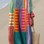 Mia Gåkjole er en livlig fejring af farver og geometriske mønstre. Med en dynamisk blanding af striber og blokke i lyse, iøjnefaldende nuancer, bringer denne kjole en følelse af sjov og individualitet til dit look. Den afslappede pasform og V-halsen sikrer komfort, samtidig med at den giver en flatterende silhuet, hvilket gør den perfekt til afslappede udflugter eller solrige dagsture.